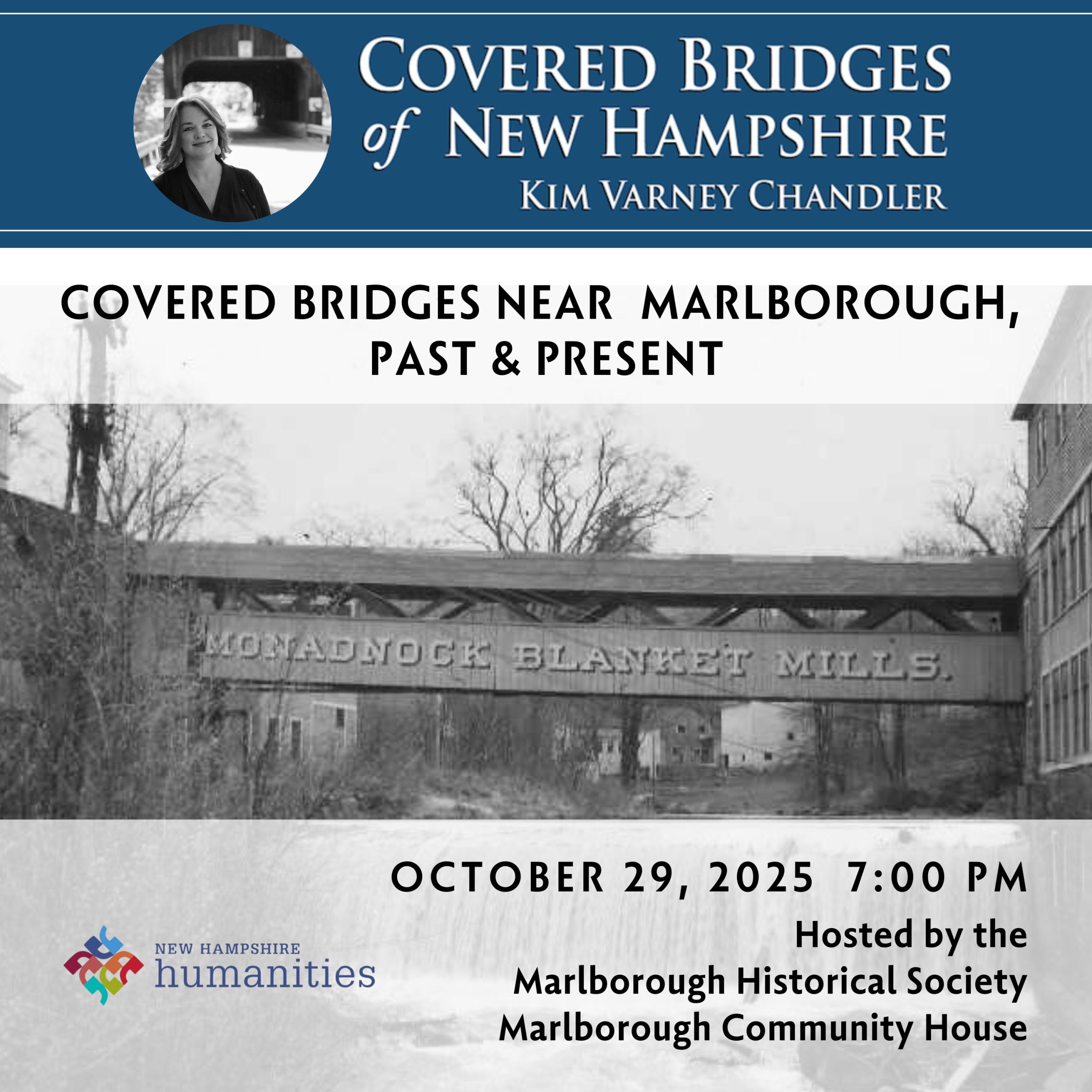 Following the presentation, Kim will be available to sign copies of Covered Bridges of New Hampshire. This program is hosted by the Marlborough Historical Society and made possible by a grant from New Hampshire Humanities. The program is open to the public.