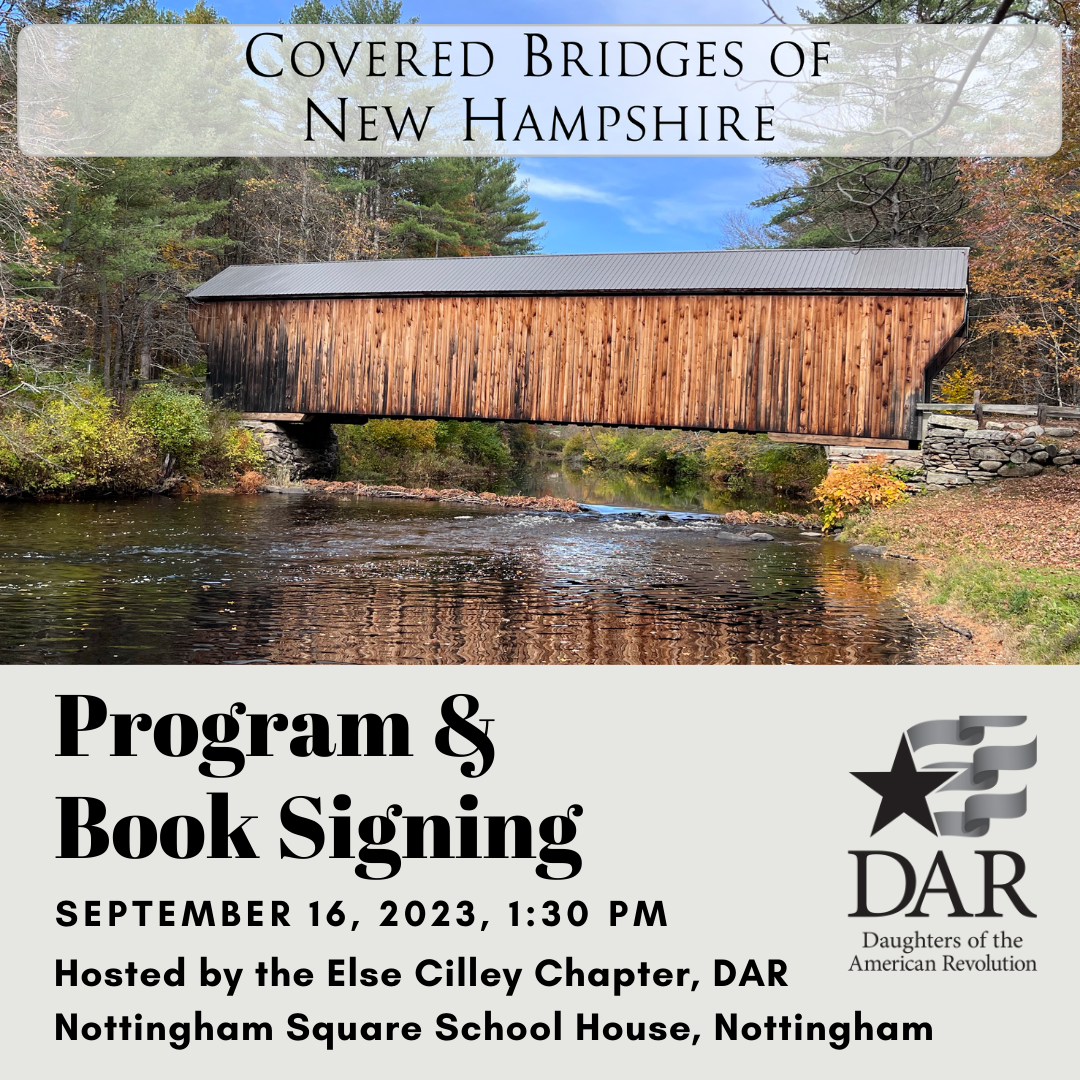New Hampshire is home to over sixty-one covered bridges, 46 of which are over a century old. Join Kim as she presents an overview of the historic covered bridges in the Granite State and the preservation efforts that ensure their survival. Guests will also learn about the Nottingham area covered bridges that have been lost to time. Following the program, Kim will be available to sign copies of Covered Bridges of New Hampshire after the program. This presentation is hosted by the Else Cilley Chapter, Daughters of the American Revolution, and the Nottingham Historical Society and is open to the public.